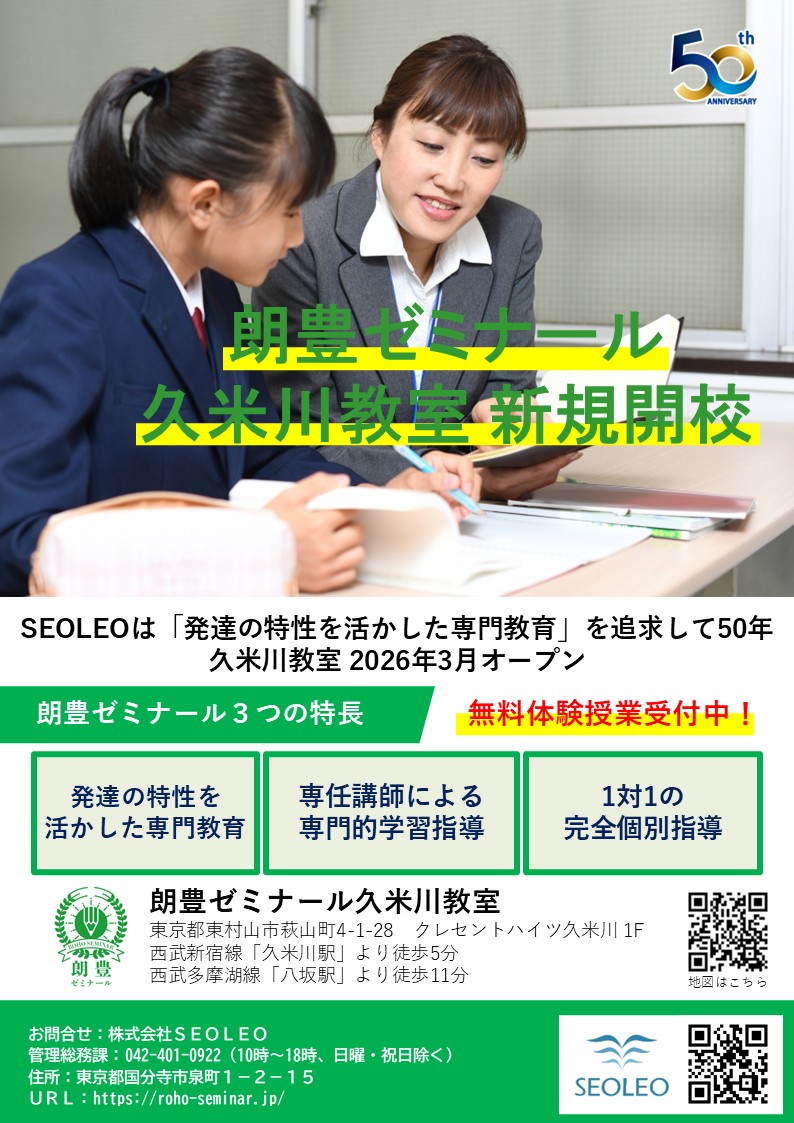 この度、東京都東村山市に「個別指導塾朗豊ゼミナール久米川教室」を開校することとなりました。